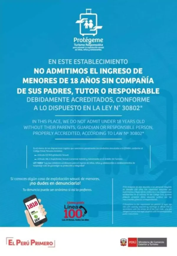 Moreover, in strict compliance with Law No. 30802, our agency implements a clear policy regarding the accompaniment of minors. We require that individuals under 18 years of age be accompanied by their parents, guardians, or a responsible adult who can provide proper accreditation. This policy is a cornerstone of our commitment to ensuring the safety and well-being of young travelers and is part of our broader efforts to foster an environment that is not only safe but also nurturing and respectful for all our clients.