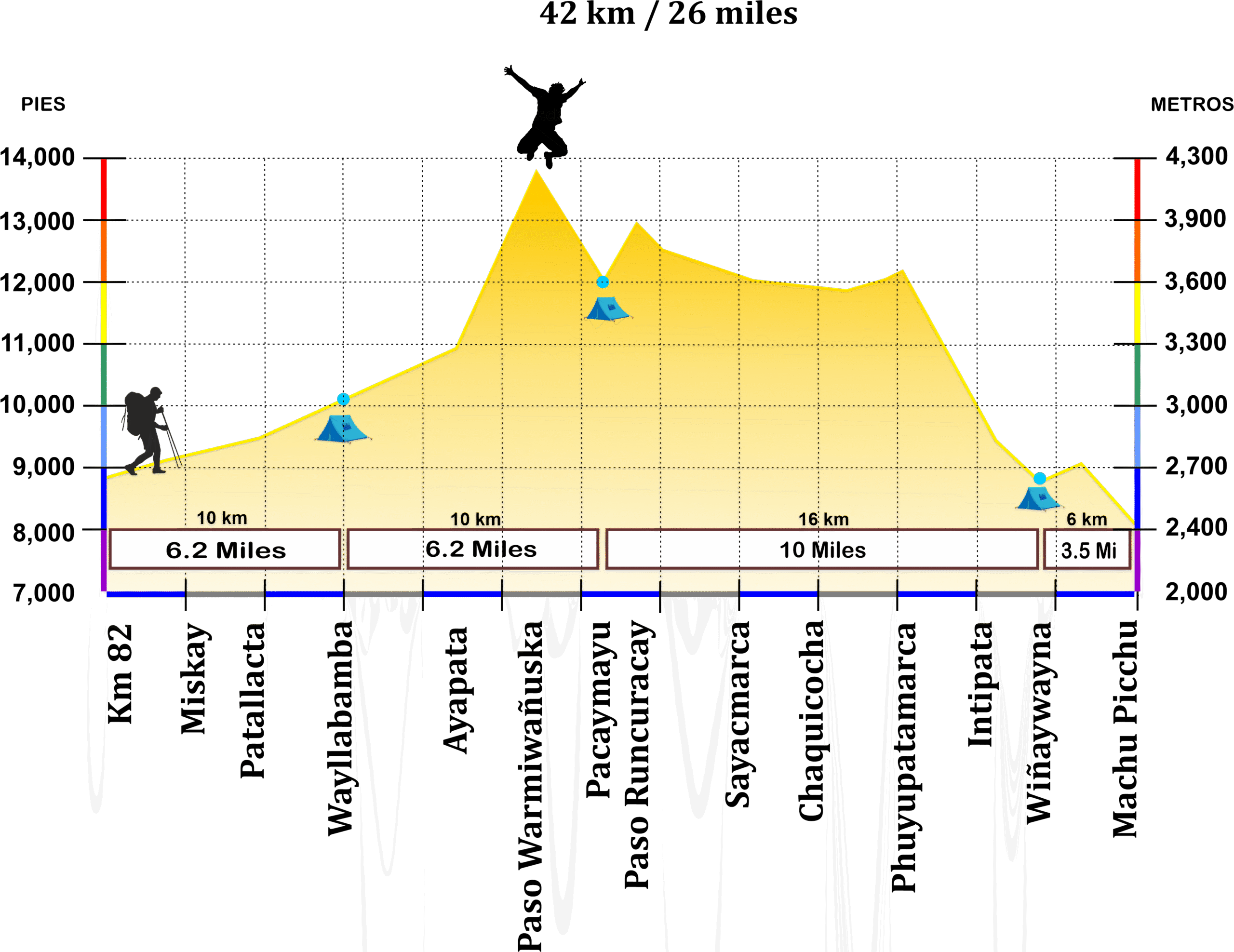 Aventúrese en un viaje inolvidable por el Camino Inca 4 dias Clásico, una famosa ruta de senderismo famosa por sus impresionantes paisajes, sus antiguas ruinas incas y sus ricas experiencias culturales. Este emblemático sendero serpentea por la impresionante cordillera de los Andes, ascendiendo desde los 1.800 metros hasta los 6.271 metros sobre el nivel del mar, y recorre aproximadamente 42 km (26 millas) en cuatro días.