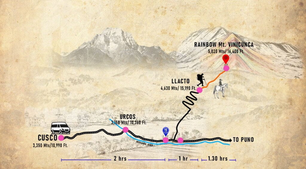 Start your day with a journey to the breathtaking Rainbow Mountain of Vinicunca, or Wininucuna. Set off from your hotel at 4:30am and travel in our secure private van on winding roads for three hours until arriving at Llacto (4,630 mts/15,190 ft above sea level). Fuel up for the trek ahead with an energizing breakfast, we stop in Colca village before we continue onward!